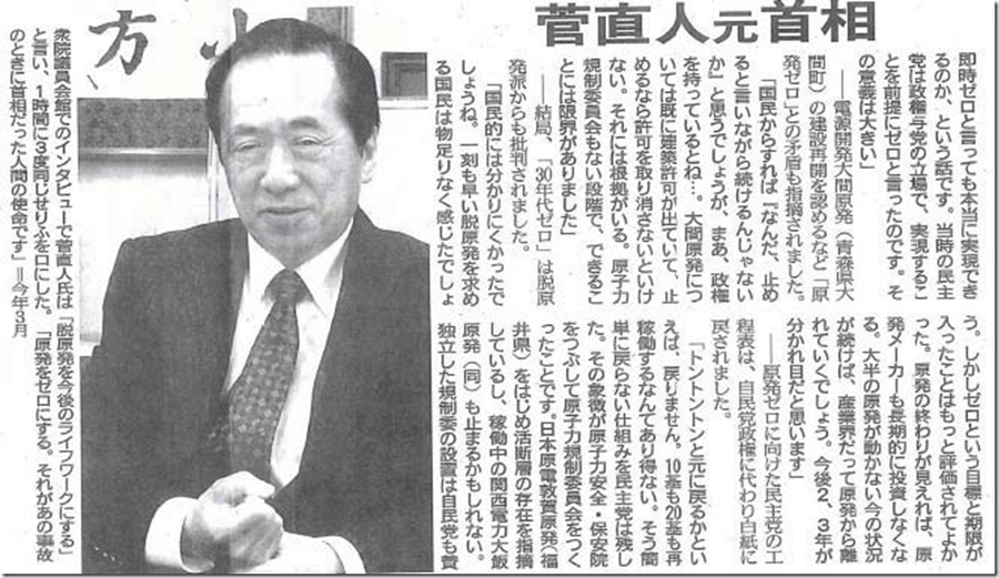 塩崎氏は「政府・与党が自民党の案を丸飲みした」としていますが、民主党の菅氏は、自分自身の手柄と考えているようです。2013年4月の北海道新聞のインタビューに菅総理はこう発言します。そこには「脱原発」の呪いとも言うべき怨念が込められていました。